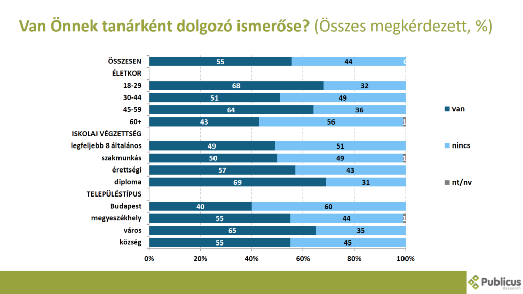 A válaszadók többségének (55 százalék) van tanárként dolgozó ismerőse. Leginkább a 18-29 évesek (68 százalék), a 45-59 évesek (64 évesek), a diplomások (69 százalék) és a városokban élők (65 százalék) mondták ezt.