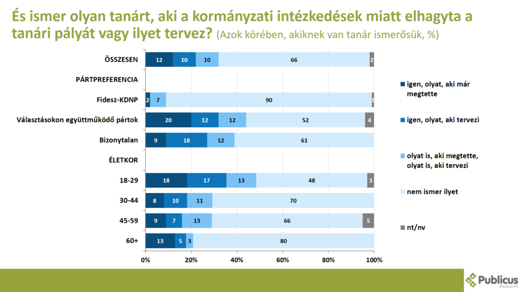 Minden tizedik válaszadó (10 százalék) ismer olyat, aki tervezi elhagyni a tanári pályát. Ezt mondta a bizonytalan szavazók közel ötöde (18 százalék), a választásokon együttműködő ellenzéki pártok szavazói közül minden nyolcadik (12 százalék).