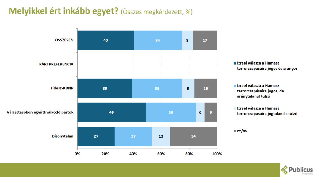 A megkérdezettek harmada (34 százalék) inkább azzal ért egyet, hogy Izrael válasza a Hamász terrorcsapásaira jogos, de aránytalanul túlzó. Így gondolja a választásokon együttműködő ellenzéki pártok szavazóinak és a Fidesz szavazóknak picit több mint harmada (36 és 35 százalék), illeve tízből közel három (27 százalék) bizonytalan szavazó.