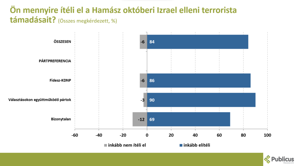 A megkérdezettek 84 százaléka inkább elitéli a Hamász októberi Izrael elleni terrorista támadásait. Így nyilatkozott a Fidesz szavazók és a választásokon együttműködő ellenzéki pártok szavazóinak túlnyomó többsége (86 és 90 százalék), illetve tízből hét (69 százalék) bizonytalan szavazó.