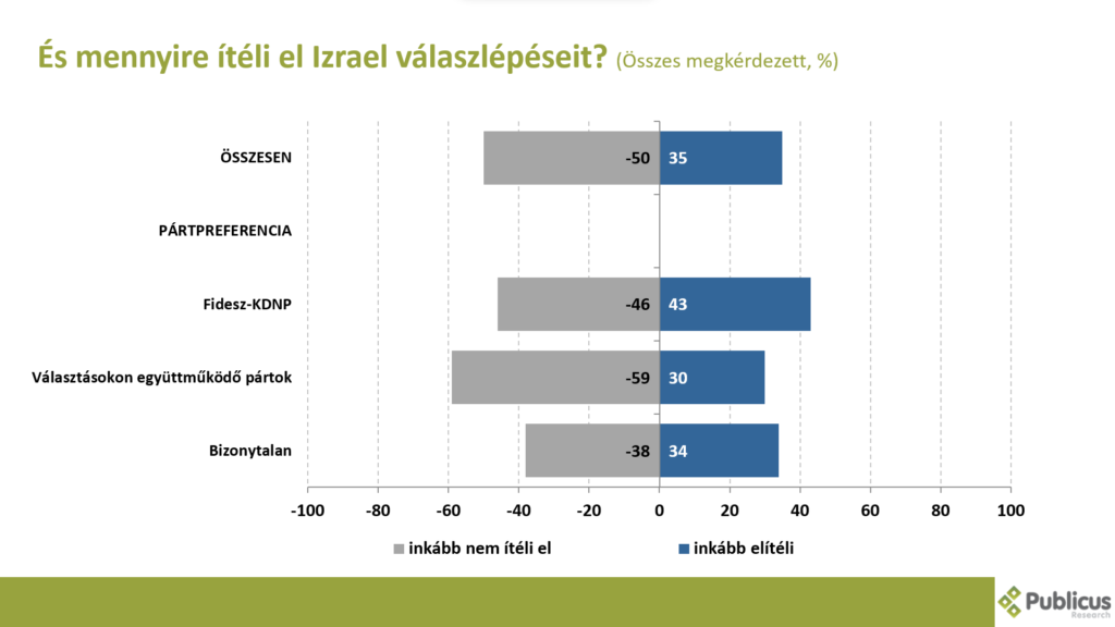 Minden második (50 százalék) megkérdezett inkább nem ítéli el Izrael válaszlépéseit. Így nyilatkozott a választásokon együttműködő ellenzéki pártok szavazói közül tízből hat (59 százalék), közel minden második (46 százalék) Fidesz szavazó, illetve tízből négy (38 százalék) bizonytalan szavazó.