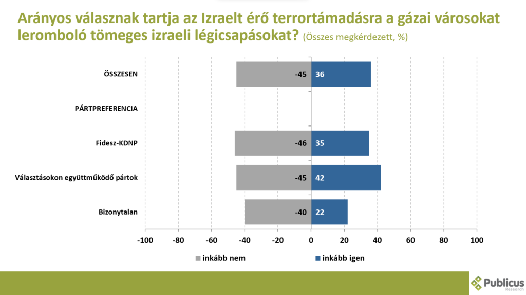 Közel minden második válaszadó (45 százalék) inkább nem tartja arányos válasznak az Izraelt érő terrortámadásra a gázai városokat leromboló tömeges izraeli légicsapásokat. Így nyilatkozott a Fidesz szavazók és a választásokon együttműködő ellenzéki pártok szavazóinak közel fele (46 és 45 százalék) illetve tízből négy (40 százalék) bizonytalan szavazó.