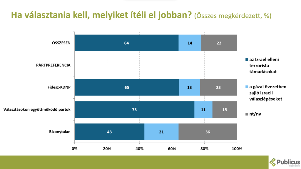 A válaszadók 14 százaléka a gázai övezetben zajló izraeli válaszlépéseket ítéli el jobban. Így nyilatkozott a bizonytalan szavazók 21 százaléka, a Fidesz szavazók 13 százaléka, illetve a választásokon együttműködő ellenzéki pártok szavazóinak a 11 százaléka.