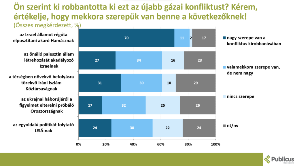 A megkérdezettek közel negyede szerint az önálló palesztin állam létrehozását akadályozó Izraelnek (27 százalék), illetve az egyoldalú politikát folytató USÁ-nak nagy szerepe van a konfliktus kirobbanásában. Közel minden ötödik (17 százalék) válaszadó Oroszországot nevezte meg, mivel az ukrajnai háborúról így akarja elterelni a figyelmet.