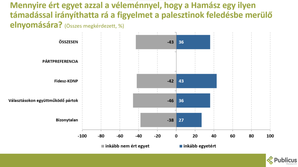 Tízből közel négy (36 százalék) válaszadó inkább egyetért azzal az állítással, hogy a Hamász egy ilyen támadással irányíthatta rá a figyelmet a palesztinok feledésbe merülő elnyomására. Így nyilatkozott a Fidesz szavazók 43 százaléka, a választásokon együttműködő ellenzéki pártok szavazóinak a 36 százaléka, illetve a bizonytalan szavazók 27 százaléka.