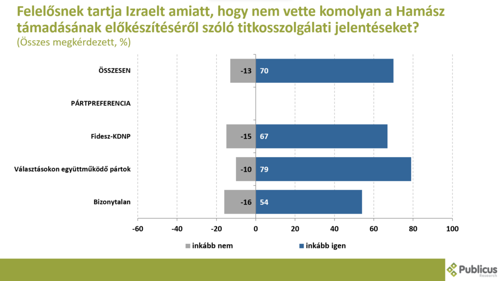 Tízből hét (70 százalék) válaszadó inkább felelősnek tartja Izraelt amiatt, hogy nem vette komolyan a Hamász támadásának előkészítéséről szóló titkosszolgálati jelentéseket. Így nyilatkozott a választásokon együttműködő ellenzéki pártok szavazói közül tízből nyolc (79 százalék), a Fidesz szavazók kétharmada (67 százalék), illetve a bizonytalan szavazók 54 százaléka.