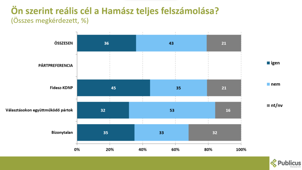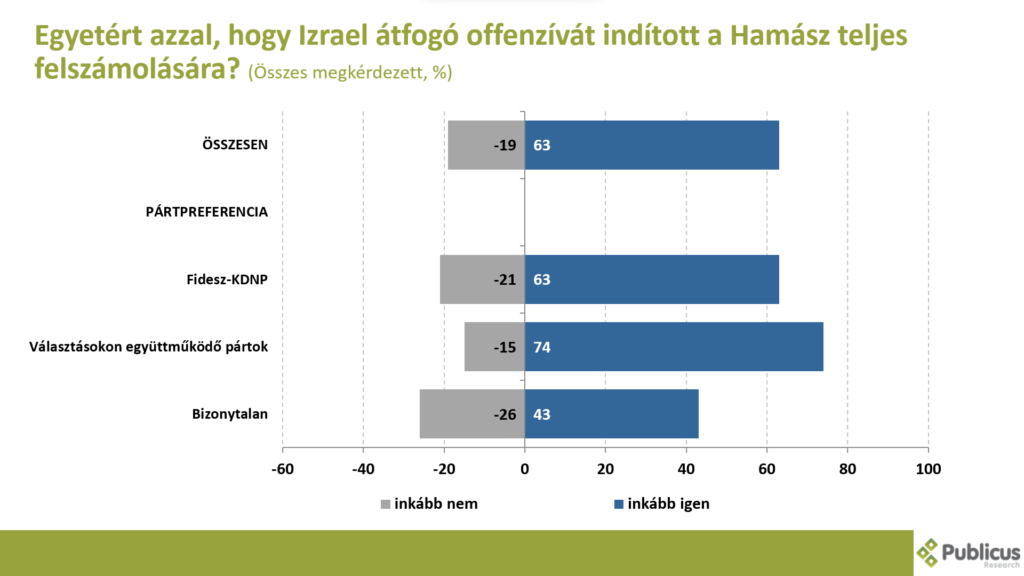 A megkérdezettek kétharmada (63 százalék) inkább egyetért azzal, hogy Izrael átfogó offenzívát indított a Hamász teljes felszámolására. Ezt mondta a választásokon együttműködő ellenzéki pártok szavazóinak háromnegyede (74 százalék), a Fidesz szavazók kétharmada (63 százalék), illetve a bizonytalan szavazók 43 százaléka.
