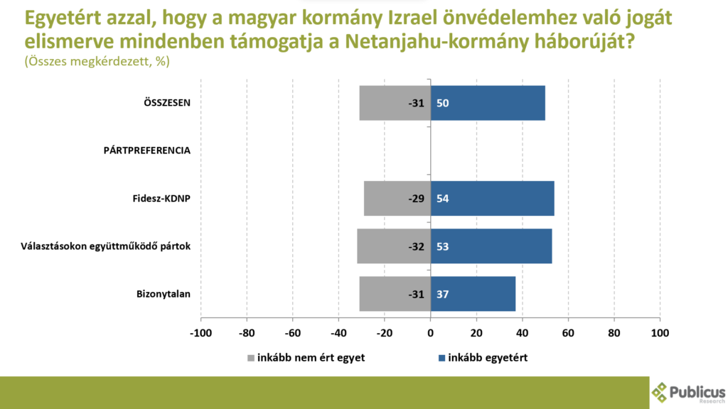 Minden második (50 százalék) válaszadó inkább egyetért azzal, hogy a magyar kormány Izrael önvédelemhez való jogát elismerve mindenben támogatja a Netanjahu-kormány háborúját. Így nyilatkozott a Fidesz szavazók és a választásokon együttműködő ellenzéki pártok szavazóinak az enyhe többsége (54 és 53 százaléka), illetve tízből közel négy (37 százalék) bizonytalan szavazó.