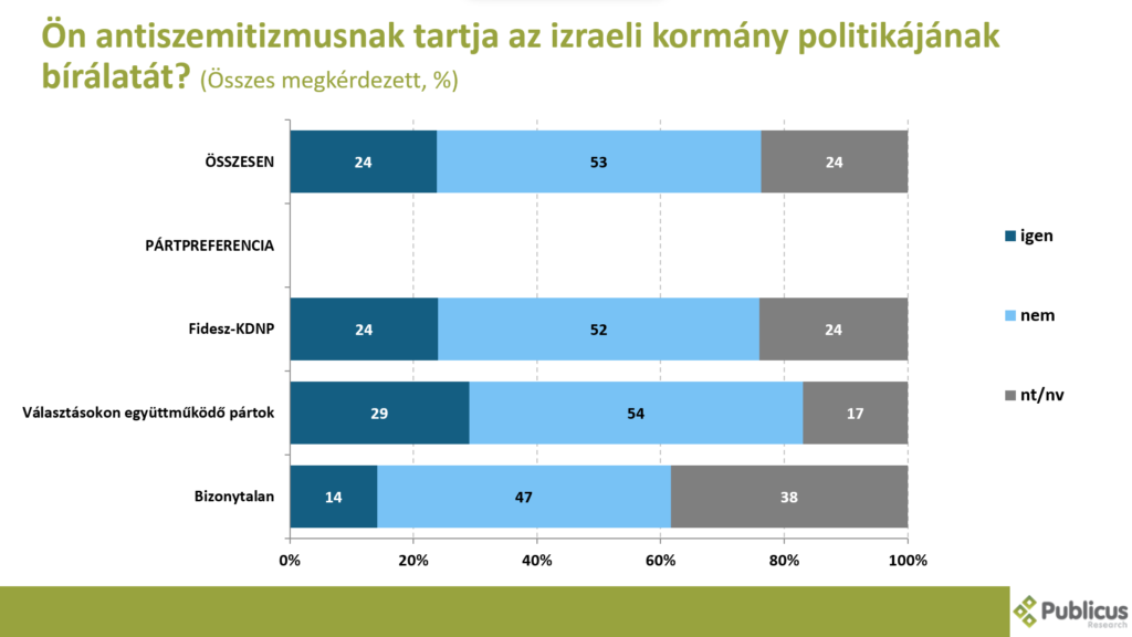 A megkérdezettek többsége (53 százalék) nem tartja antiszemitizmusnak az izraeli kormány politikájának bírálatát. Ezt mondta a Fidesz szavazók és a választásokon együttműködő ellenzéki pártok szavazóinak az enyhe többsége (52 és 54 százaléka), illetve tízből közel öt (47 százalék) bizonytalan szavazó.