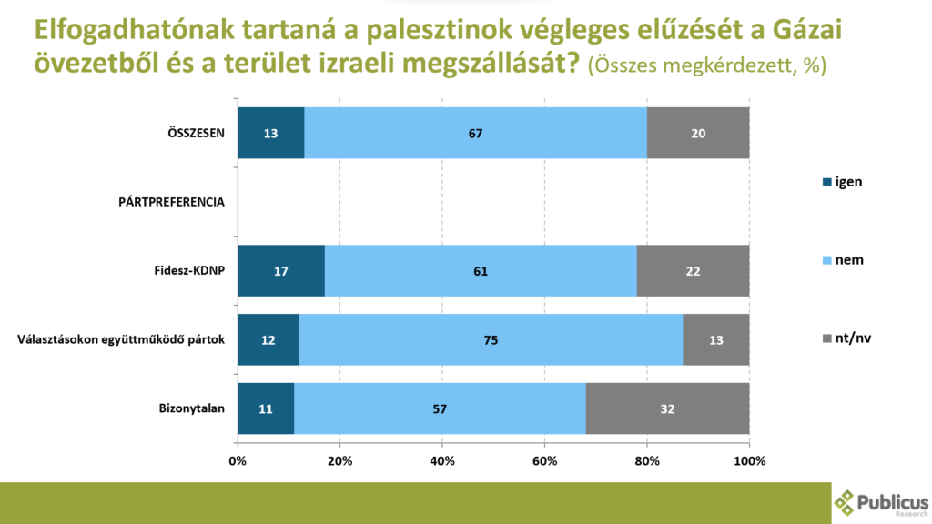 A válaszadók kétharmada (67 százalék) nem tartaná elfogadhatónak a palesztinok végleges elűzését a Gázai övezetből és a terület izraeli megszállását. Így nyilatkozott a választásokon együttműködő ellenzéki pártok szavazóinak a háromnegyede (75 százalék), illetve a Fidesz szavazók közül és a bizonytalan szavazók közül is tízből közel hat (61 százalék és 57 százalék).