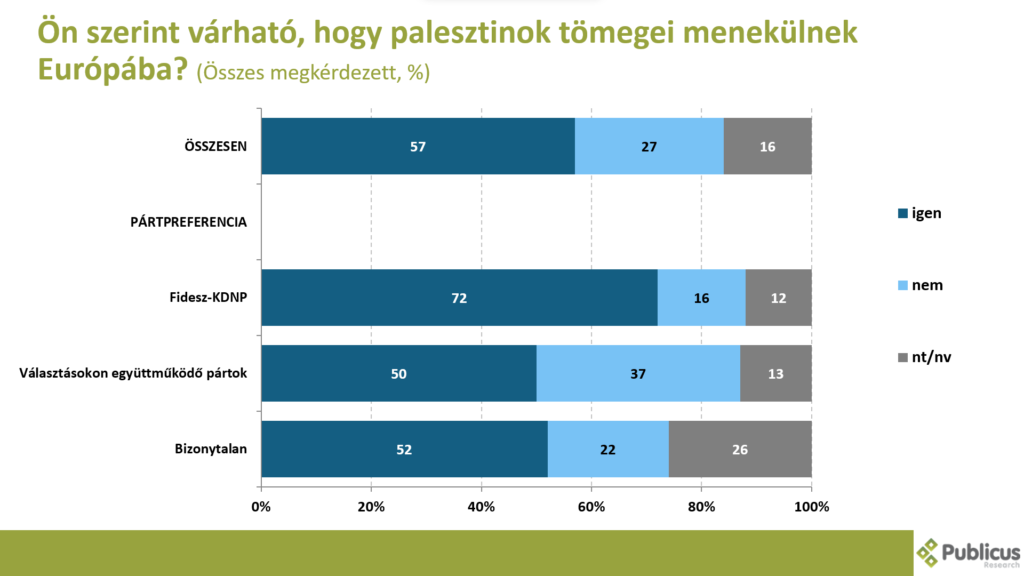 Tízből közel hat (57 százalék) megkérdezett szerint várható, hogy palesztinok tömegei menekülnek Európába. Így látja a Fidesz szavazók közel háromnegyede (72 százalék), illetve a választásokon együttműködő ellenzéki pártok szavazóinak és a bizonytalan szavazóknak a fele (50-52 százalék).