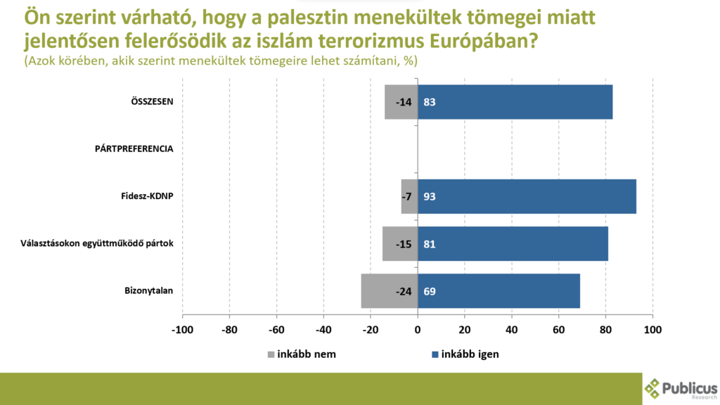Azok körében, akik szerint palesztin menekültek tömegeire lehet számítani, tízből nyolc (83 százalék) válaszadó szerint várható az, hogy emiatt felerősödik az iszlám terrorizmus Európában. Így gondolja tízből kilenc (93 százalék) Fidesz szavazó, a választásokon együttműködő ellenzéki pártok szavazó közül tízből nyolc (81 százalék) illetve tízből hét (69 százalék) bizonytalan szavazó.