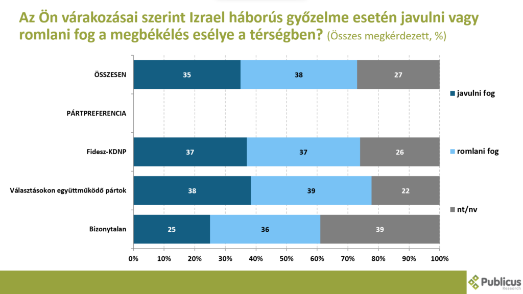 A válaszadók 35 százaléka szerint javulni, 38 százalék szerint pedig romlani fog Izrael háborús győzelme esetén a megbékélés esélye a térségben.