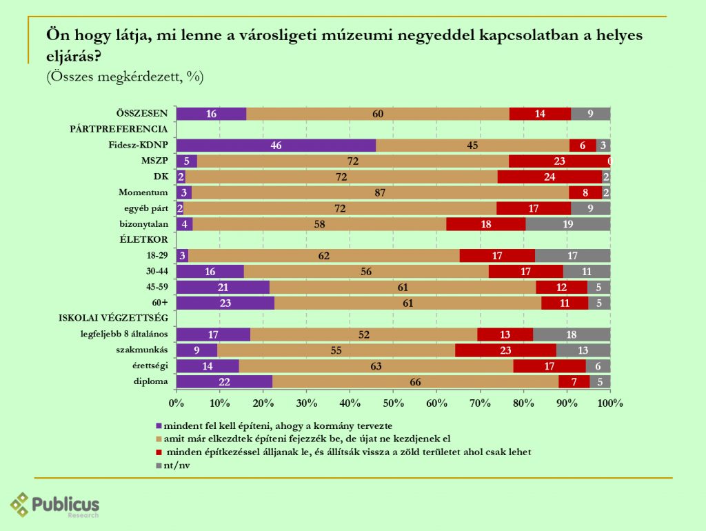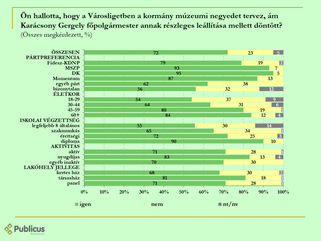 A megkérdezettek majd’ háromnegyede hallotta, hogy Karácsony Gergely főpolgármester a kormány által a Városligetben épített múzeumi negyed építésének részleges leállítása mellett döntött. A válaszadók háromnegyede a Liget-projekt leállítása mellett van. Ezen belül tízből hat fő szerint a már elkezdett épületeket fejezzék be, de újakat ne építsenek. 14 százalék szerint az lenne a jó megoldás, ha minden építkezéssel leállnának, és visszaállítanák a zöldterületet ahol csak az lehetségesLeginkább a Fidesz szavazók felépítés-pártiak, ám körükben sincs többségben ez az álláspont, mert több mint felük nem folytatná a projektet. Az ellenzéki szavazók és a bizonytalanok elsöprő arányban a projekt leállítása mellett vannak, és mindössze 3 százalékuk építené fel a múzeumi negyedet a kormány tervei szerint.