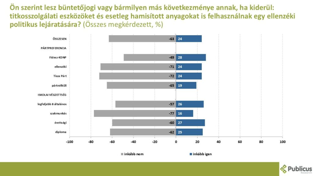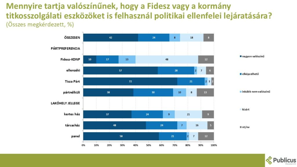Azt, hogy a Fidesz vagy a kormány titkosszolgálati eszközöket is felhasznál politikai ellenfelei lejáratására válaszadók relatív többsége (42 százalék) nagyon valószínűnek vagy legalább elképzelhetőnek (24 százalék) tartotta. Legnagyobb mértékben a Tisza Párt támogatói tartoztak ebbe a csoportba (93 százalék), de az ellenzéki (85 százalék) és a pártnélküli (68 százalék) szavazók abszolút többsége is így vélekedett, meglepő módon a Fidesz szavazóinak negyedével (27 százalék) egyetemben.