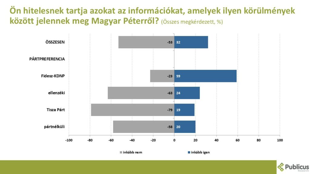 Az ilyen körülmények között Magyar Péterről megjelent információkat a megkérdezettek mindössze egyharmada (32 százalék) tartotta hitelesnek. Minden negyedik ellenzéki (24%), minden ötödik pártnélküli (20 százalék) illetve Tisza Párti (19 százalék) megkérdezett válaszolt így, a Fidesz szavazóknak 59 százalékával egyetemben.