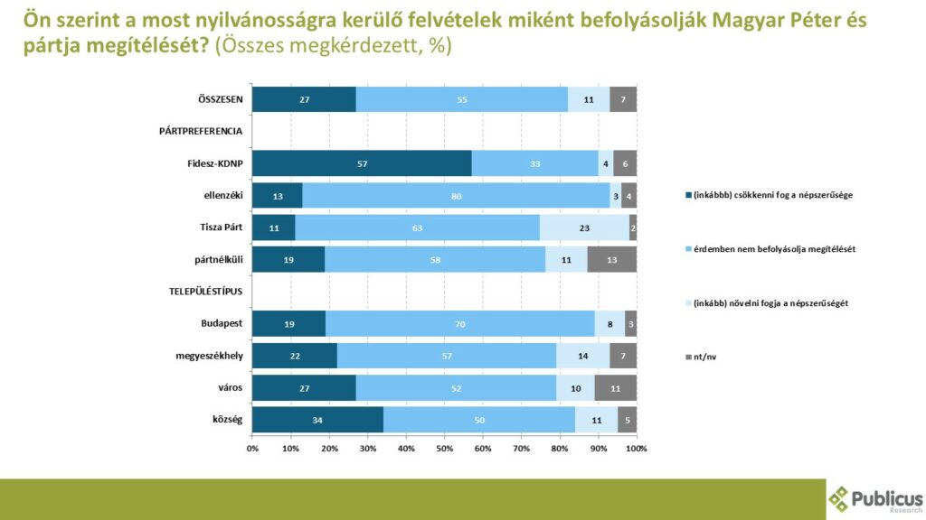 Az előbbi adatok fényében nem meglepő, hogy a most nyilvánosságra kerülő felvételek a többség (55 százalék) szerint nem befolyásolják majd érdemben Magyar Péter és pártja megítélését. Ennek ellenkezőjét mindössze kormánypárti szavazók csoportjában vallotta a többség (57 százalék), minden ötödik pártnélküli (19 százalék), és tizedik ellenzéki (13 százalék) illetve Tisza Párti (11 százalék) szavazóval egyetemben. Minél kevésbé volt urbánus egy válaszadó, annál nagyobb valószínűséggel nyilatkozott így.