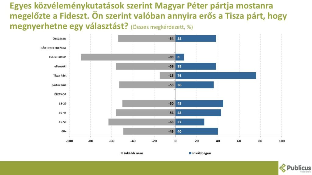 A friss közvéleménykutatások ellenére a többség (54 százalék) szerint a Tisza Párt még nem elég erős ahhoz, hogy megnyerjen egy választást. Így vélekedett a tízből kilenc (89 százalék) Fidesz szavazó, az ellenzéki és pártnélküli szavazók fele (56 százalék illetve 53 százalék), illetve a Tisza Párt szavazóinak 15 százaléka. A válaszadók között mindössze a Tisza Párt szavazói között voltak többségben (76 százalék) azok, akik szerint a párt van elég erős egy választási győzelemhez.