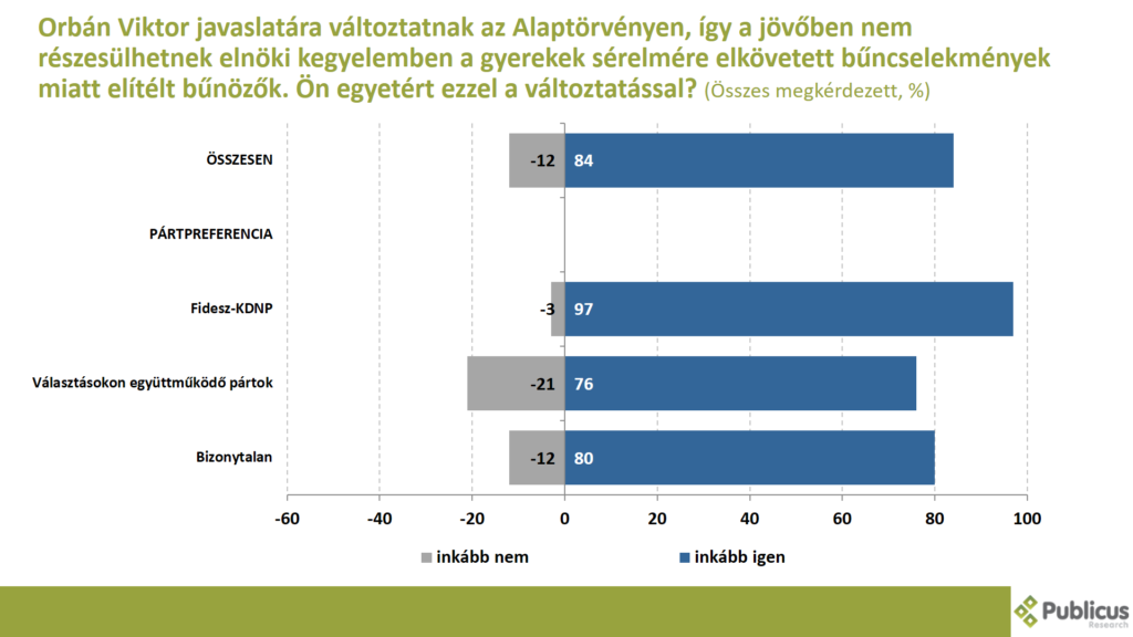 A válaszadók 84 százaléka inkább egyetért azzal az alaptörvényi változtatással, hogy a jövőben nem részesülhetnek elnöki kegyelemben a gyerekek sérelmére elkövetett bűncselekmények miatt elítélt bűnözők. Így nyilatkozott szinte az összes Fidesz szavazó (97 százalék), tízből nyolc (80 százalék) bizonytalan szavazó, illetve a választásokon együttműködő ellenzéki pártok szavazóinak a háromnegyede. (76 százalék)