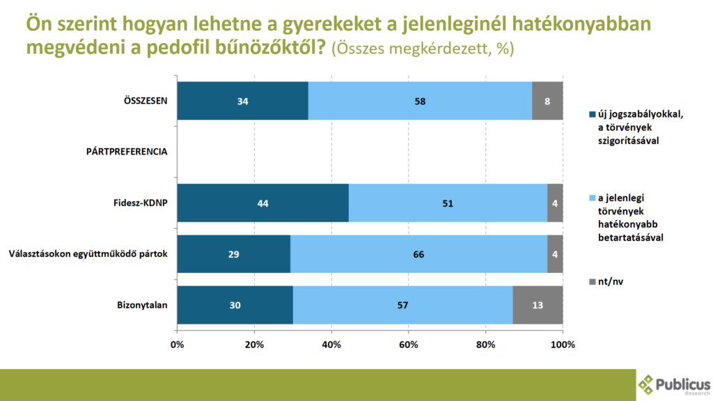 Tízből hat (58 százalék) megkérdezett szerint a jelenlegi törvények hatékonyabb betartatásával lehetne a gyerekeket a jelenleginél hatékonyabban megvédeni a pedofil bűnözőktől. Így látja a választásokon együttműködő ellenzéki pártok szavazóinak a kétharmada (66 százalék), tízből hat (57 százalék) bizonytalan szavazó, illetve minden második (51 százalék) Fidesz szavazó.