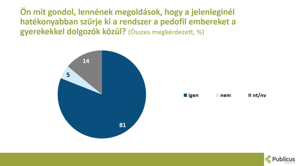 Tízből nyolc (81 százalék) megkérdezett úgy gondolja, hogy lennének megoldások, hogy a jelenleginél hatékonyabban szűrje ki a rendszer a pedofil embereket a gyerekekkel dolgozók közül. (5 százalék szerint nem, 14 százalék pedig nem tudott, vagy nem akart válaszolni a kérdésre).