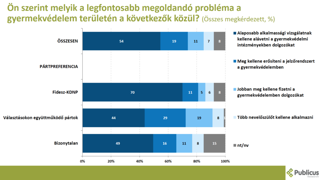 Minden ötödik (19 százalék) megkérdezett szerint meg kellene erősíteni a jelzőrendszert a gyermekvédelemben. Ezt mondta a választásokon együttműködő ellenzéki pártok szavazói közül tízből három (29 százalék), a bizonytalan szavazók 16 százaléka, illetve a Fidesz szavazók 11 százaléka.