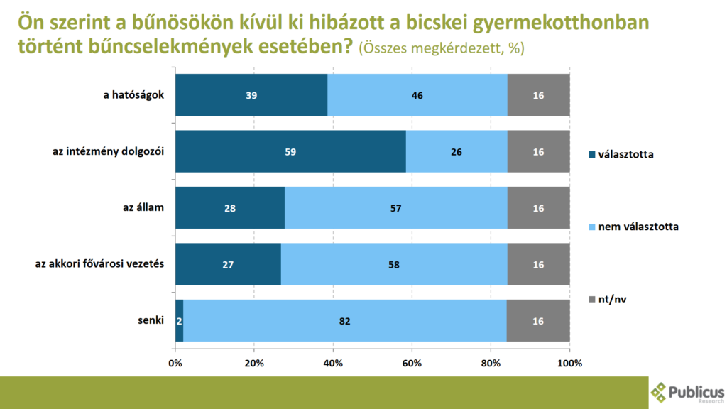 A bicskei gyermekotthonban történt bűncselekmények esetében tízből hat válaszadó szerint az intézmény dolgozói, tízből négy megkérdezett szerint a hatóságok hibáztak. Tízből közel hárman az államot, illetve közel ugyanilyen arányban az akkori fővárosi vezetést nevezte még meg. (több választ is lehetett adni ennél a kérdésnél).