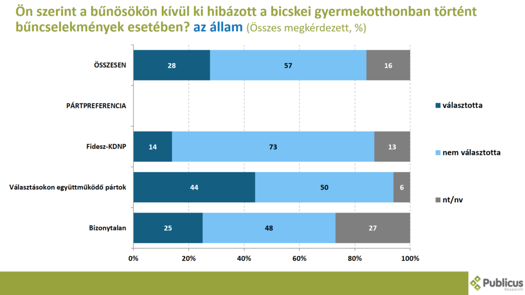 A választásokön együttműködő ellenzéki pártok szavazóinak a 44 százaléka, a bizonytalan szavazók 25 százaléka, illetve a Fidesz szavazók 14 százaléka mondta azt, hogy a bicskei gyermekotthonban történt bűncselekmények esetében az állam hibázott.