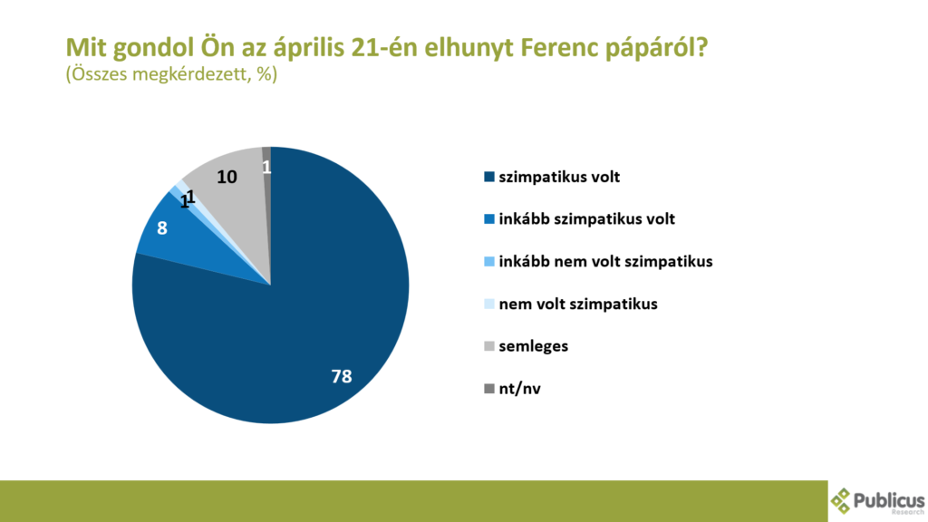 Tízből közel kilenc (86 százalék) válaszadó mondta azt, hogy vagy szimpatikus (78 százalék) vagy pedig inkább szimpatikus volt (8 százalék) számára az április 21-én elhunyt Ferenc Pápa.