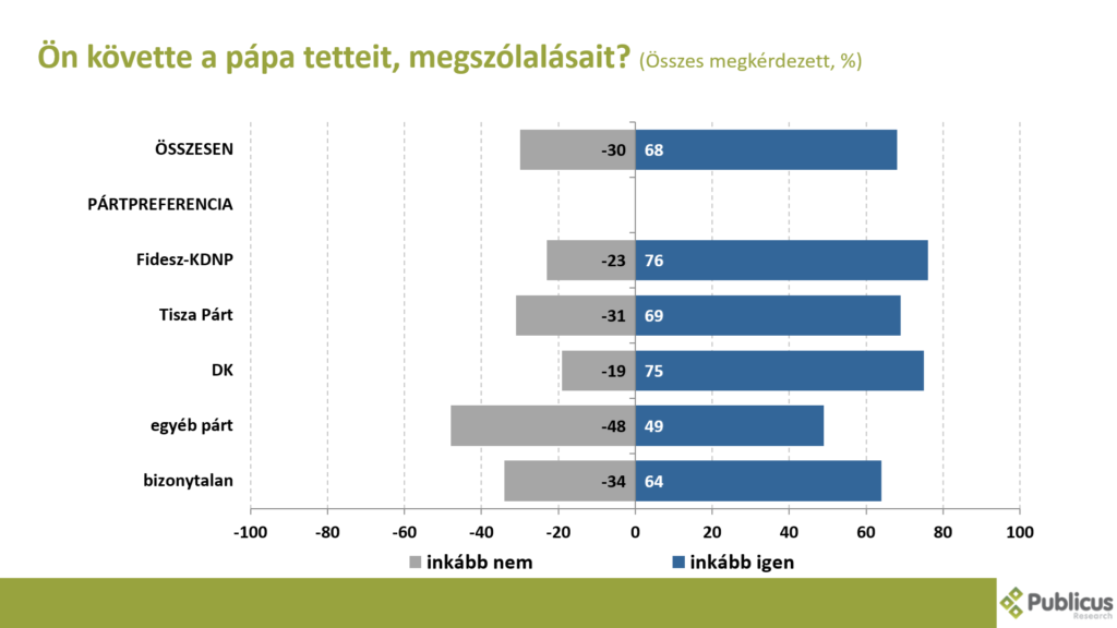 Tízből hét (68 százalék) válaszadó mondta azt, hogy követte a pápa tetteit, megszólalásait. Így nyilatkozott a Fidesz szavazók 76 százaléka, a DK szavazók 75 százaléka, a Tisza Párt szavazóinak 69 százaléka, illetve a bizonytalan szavazók 64 százaléka.