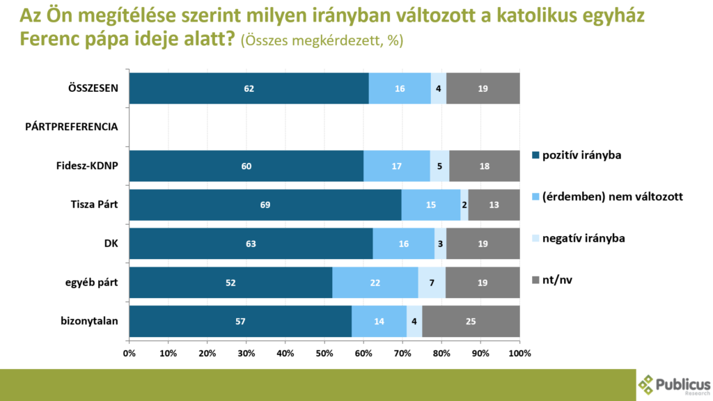 A megkérdezettek 4 százaléka mondta azt, hogy megítélésük szerint negatív irányba változott a katolikus egyház Ferenc pápa ideje alatt. Így látja a Fidesz szavazók 5 százaléka, a bizonytalan szavazók 4 százaléka, a DK szavazók 3 százaléka, illetve a Tisza Párt szavazóinak a 2 százaléka.