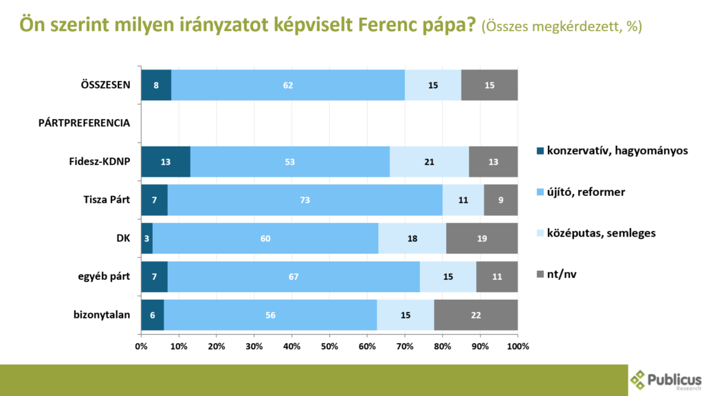 A válaszadók 8 százaléka szerint Ferenc pápa konzervatív, hagyományos irányzatot képviselt. Így nyilatkozott a Fidesz szavazók 13 százaléka, a Tisza Párt szavazóinak a 7 százaléka, a bizonytalan szavazók 6 százaléka, illetve a DK szavazók 3 százaléka.