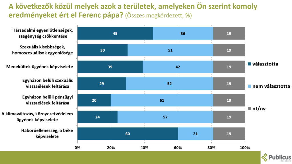 Tízből hat (60 százalék) válaszadó mondta azt, hogy a háborúelleneségben, a béke képviseletében komoly eredményeket ért el Ferenc pápa. A megkérdezettek közel fele (45 százalék) szerint a társadalmi egyenlőtlenségek, illetve a szegénység csökkentése az a terület, ahol komoly eredményeket ért a volt egyházfő. Tízből négy (39 százalék) válaszadó a menekültek ügyének a képviseletét nevezte meg.