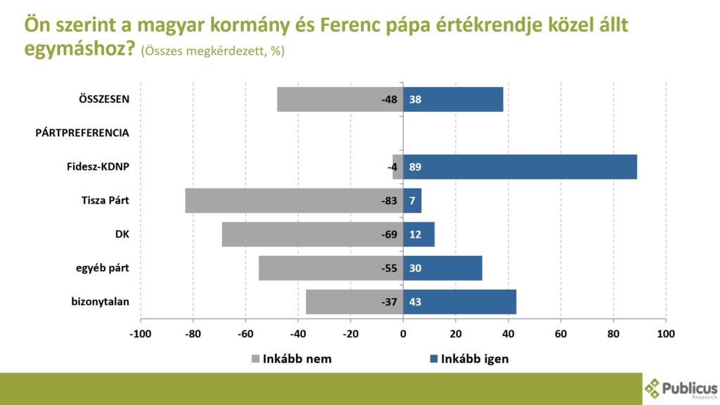Közel minden második (48 százalék) válaszadó szerint a magyar kormány és Ferenc pápa értékrendje inkább nem állt közel egymáshoz. Így nyilatkozott a Tisza Párt szavazóinak 83 százaléka, a DK szavazók 69 százaléka, a bizonytalan szavazók 37 százaléka, illetve a Fidesz szavazók 4 százaléka.
