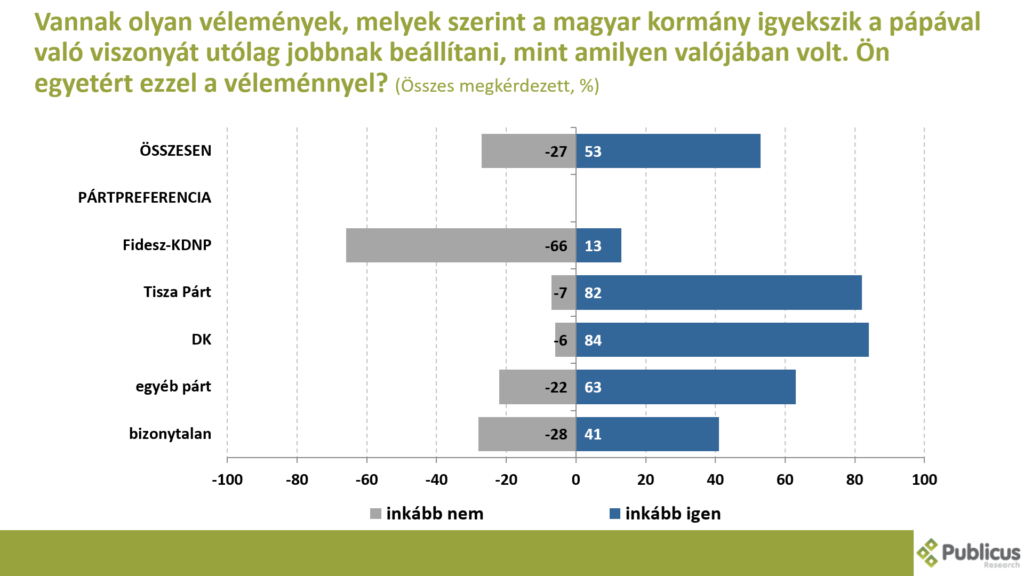 Vannak olyan vélemények, melyek szerint a magyar kormány igyekszik a pápával való viszonyát utólag jobbnak beállítani, mint amilyen valójában volt. A többség (53 százalék) inkább egyetért ezzel a véleménnyel. Így nyilatkozott a DK szavazók 84 százaléka, a Tisza Párt szavazóinak a 82 százaléka, a bizonytalan szavazók 41 százaléka, illetve a Fidesz szavazók 13 százaléka.