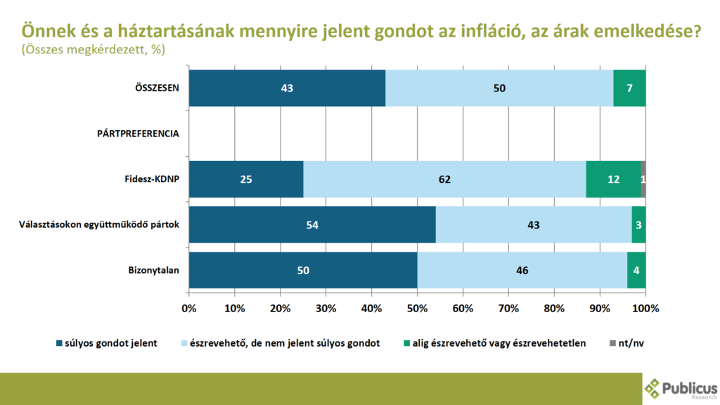 Tízből négy (43 százalék) megkérdezett mondta azt, hogy súlyos gondot jelent neki az infláció, az árak emelkedése. Így nyilatkozott a választásokon együttműködő ellenzéki pártok szavazóinak a többsége (54 százalék), minden második (50 százalék) bizonytalan szavazó, továbbá a Fidesz szavazók negyede (25 százalék).