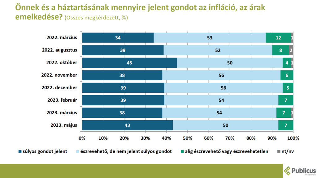 2022 októberéhez képest 2 százalékponttal csökkent azok aránya, akik azt mondták, hogy súlyos gondot jelent nekik az infláció (egyúttal azonban a mostani 43 százalékos arány 9 százalékkal magasabb mint a 2022 márciusában volt, még az országgyűlési választás előtt)