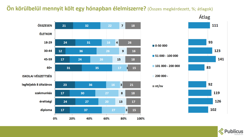 A válaszadók átlagban 111 ezer forintot költenek egy hónapban élelmiszerre. (2023 márciusában még 105 ezer forint volt ez az összeg). A mostani felmérésünk eredményei szerint a megkérdezettek harmada (32 százalék) 51-100 ezer forintot, minden ötödik (21 százalék) 0-50 ezer forintot, szintén minden ötödik válaszadó (22 százalék) pedig 101-200 ezer forintot költ egy hónapban élelmiszerre.