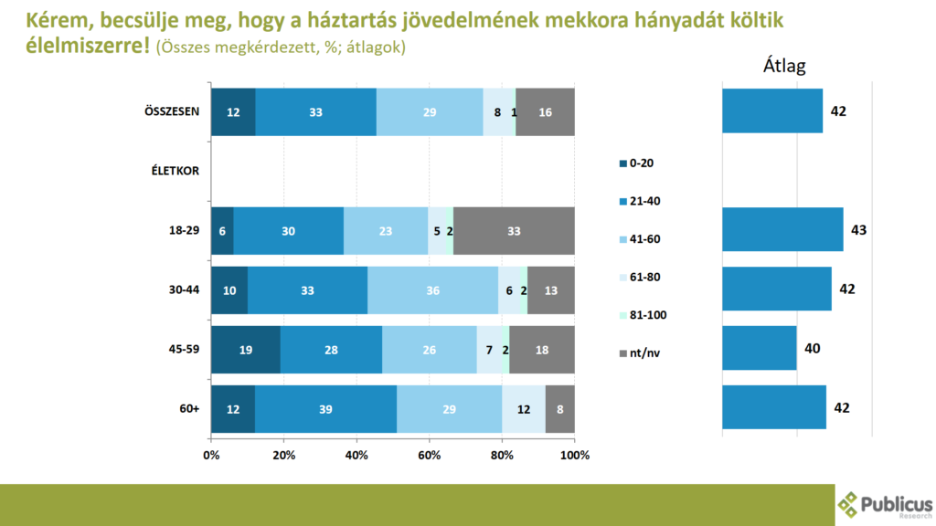 A megkérdezettek úgy becsülték meg, hogy átlagban a háztartásuk jövedelmének a 42 százalékát költik élelmiszerre. (2023 márciusában még 39 százalék volt ez az arány). A mostani felmérésünk során a legtöbbet a 18-29 évesek becsültek (43 százalékot)