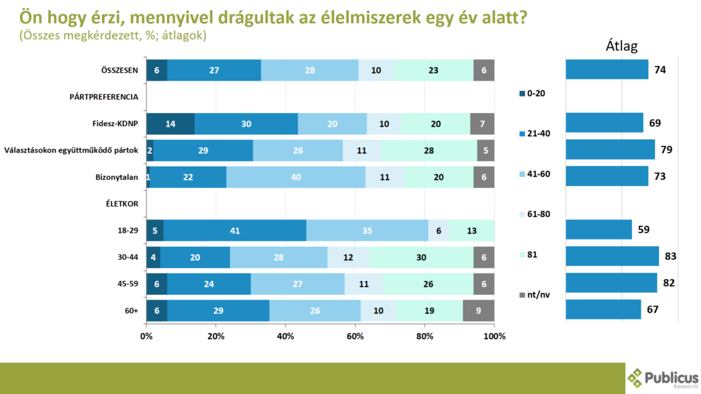 A válaszadók úgy érzik, hogy átlagban 74 százalékkal drágultak az élelmiszerek egy év alatt. A Fidesz szavazók 69 százalékos, a választásokon együttműködő ellenzéki pártok szavazói 79 százalékos, a bizonytalan szavazók pedig 73 százalékos drágulásról számoltak be. Életkor alapján a legnagyobb drágulást a 30-44 év közöttiek és a 45-59 év közöttiek tapasztaltak. (83 és 82 százalék).