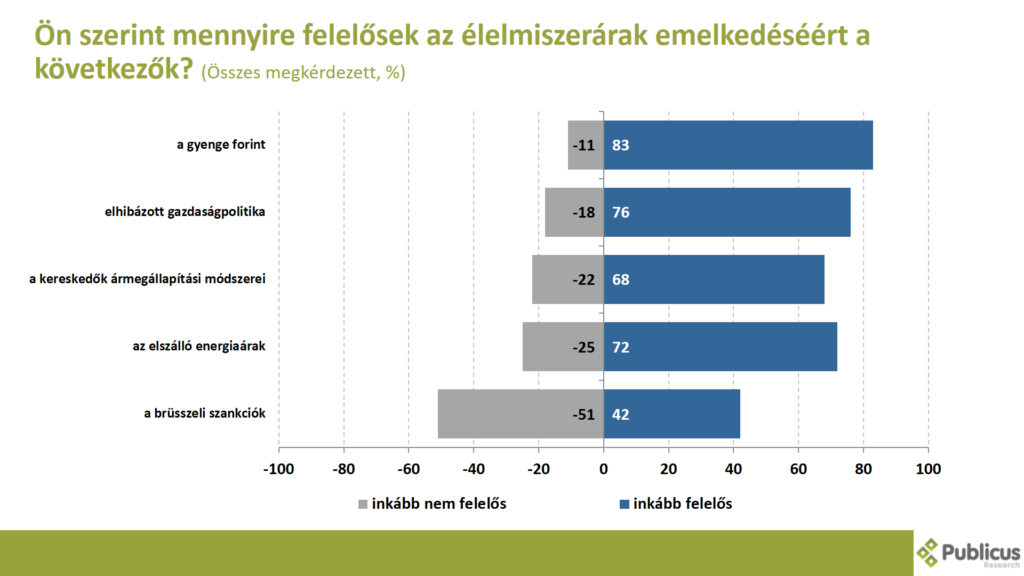 A megkérdezettek túlnyomó többsége szerint (83 százalék) a gyenge forint inkább felelős az élelmiszerárak emelkedéséért. A válaszadók háromnegyede (76 százalék) inkább a kormány elhibázott gazdaságpolitikáját okolja, közel ilyen arányban (72 százalék) pedig inkább az elszálló energiaárakat. A megkérdezettek kétharmada (68 százalék) inkább a kereskedők ármegállapítási módszereit nevezte meg. A brüsszeli szankciók csak ezek után következnek (42 százalék).