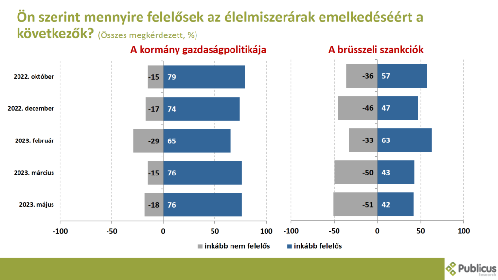 A 2023 februári visszaesés után újra jelentősen növekedett azok aránya, (65 százalékról 76 százalékra) akik szerint a kormány gazdaságpolitikája inkább felelős az élelmiszerárak emelkedéséért. Egyúttal pedig jelentősen csökkent azok aránya (63 százalékról 42 százalékra) akik szerint inkább a brüsszeli szankciók okolhatók a jelenlegi árakért.
