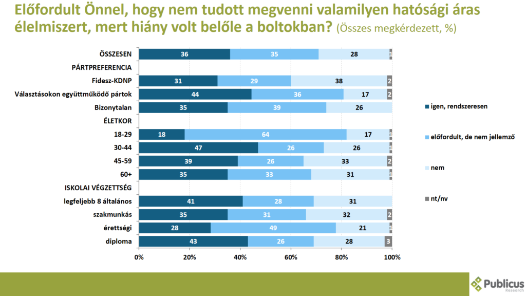 Leginkább a 30-44 év közöttiek (47 százalék) és a diplomások (43 százalék) mondták azt, hogy rendszeresen előfordult vele olyan, hogy nem tudott megvenni valamilyen hatósági áras élelmiszert, mert hiány volt belőle a boltokban.