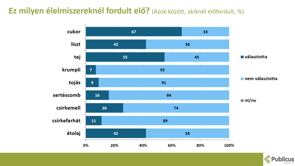 Azok körében, akiknél előfordult hogy nem tudtak valamilyen hatósági áras élelmiszert megvenni, a legtöbben a cukorra (67 százalék), a tejre (55 százalék) a lisztre (42 százalék) és az étolajra (42 százalék) panaszkodtak. Ezeknél jóval kevesebb panasz érkezett a csirkemell (26 százalék), a sertéscomb (16 százalék), a tojás (9 százalék), a csirkefarhát (11 százalék), és a krumpli (7 százalék) hiányára.
