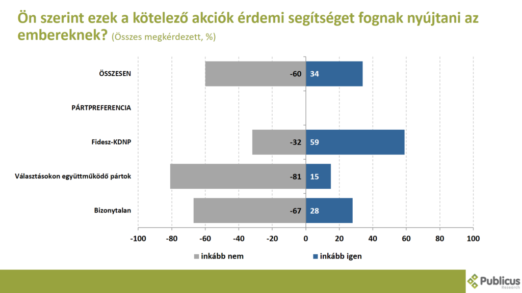 Tízből hat (60 százalék) válaszadó szerint ezek a kötelező akciók inkább nem fognak érdemi segítséget nyújtani az embereknek. Így gondolja a választásokon együttműködő ellenzéki pártok szavazói közül tízből nyolc (81 százalék), a bizonytalan szavazók kétharmada (67 százalék), illetve a Fidesz szavazók harmada (34 százalék).