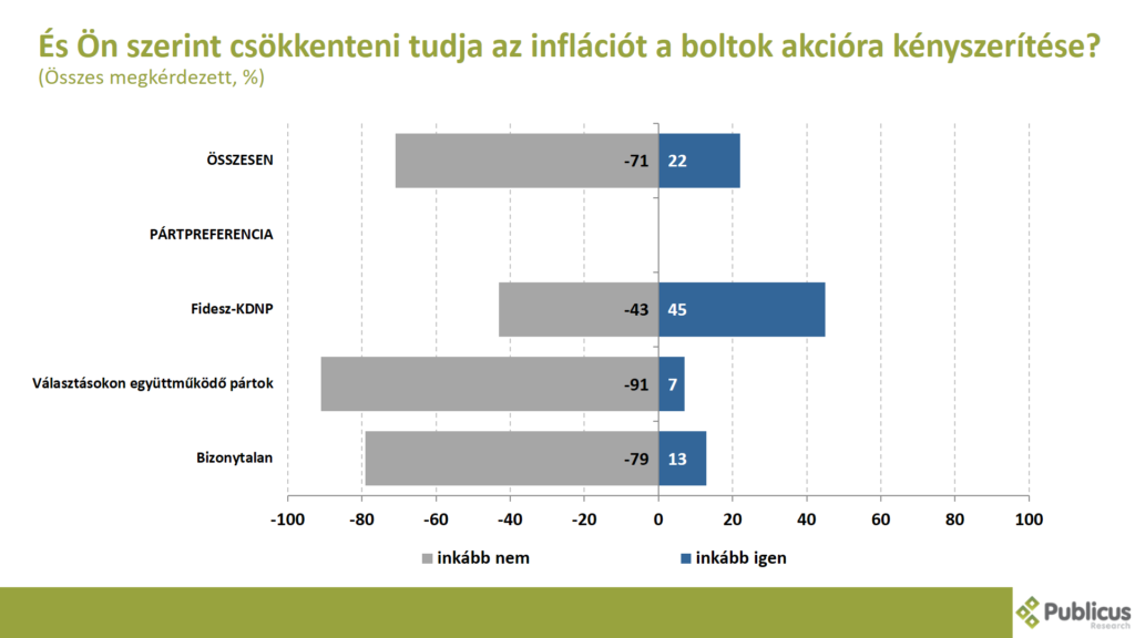 A megkérdezettek ötöde (22 százalék) szerint a boltok akcióra kényszerítése inkább képes lesz csökkenteni az inflációt. Így gondolja közel minden második (45 százalék) Fidesz szavazó, a bizonytalan szavazók 13 százaléka, illetve a választásokon együttműködő ellenzéki pártok szavazóinak a 7 százaléka.