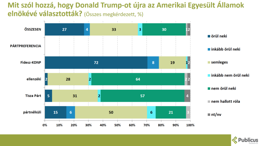 Tízből három (31 százalék) válaszadó vagy örül neki (27 százalék), vagy inkább örül neki (4 százalék), hogy Donald Trump-ot újra az Amerikai Egyesült Államok elnökévé választották. Így nyilatkozott tízből nyolc (80 százalék) Fidesz szavazó, a pártnélküliek ötöde (21 százalék), a Tisza Párt szavazóinak az 5 százaléka, illetve az ellenzéki szavazók 2 százaléka.