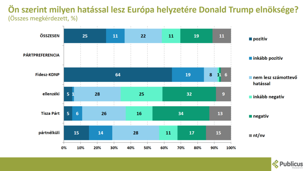 Tízből közel négy (36 százalék) válaszadó szerint vagy pozitív (25 százalék), vagy inkább pozitív (11 százalék), hatással lesz Európa helyzetére Donald Trump elnöksége. Így nyilatkozott tízből nyolc (83 százalék) Fidesz szavazó, a pártnélküliek közül tízből három (29 százalék), a Tisza Párt szavazóinak a 11 százaléka, illetve az ellenzéki szavazók 6 százaléka.