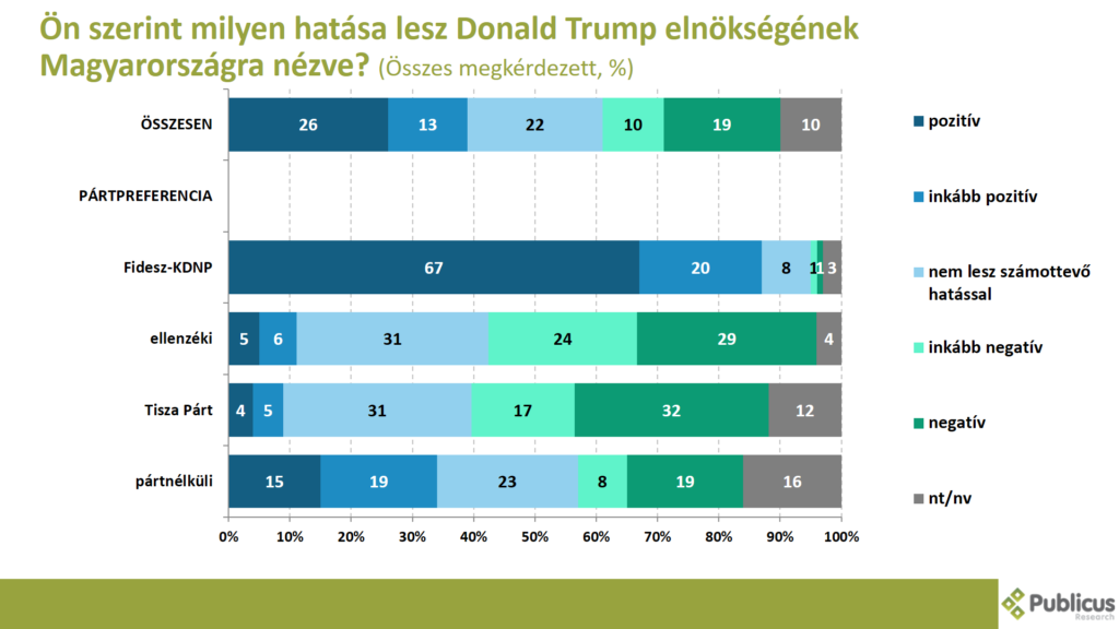 Tízből közel négy (39 százalék) válaszadó szerint vagy pozitív (26 százalék), vagy inkább pozitív (13 százalék), hatással lesz Magyarország helyzetére Donald Trump elnöksége. Így nyilatkozott tízből kilenc (87 százalék) Fidesz szavazó, a pártnélküliek harmada (34 százalék), az ellenzéki szavazók 11 százaléka, illetve a Tisza Párt szavazóinak a 9 százaléka.