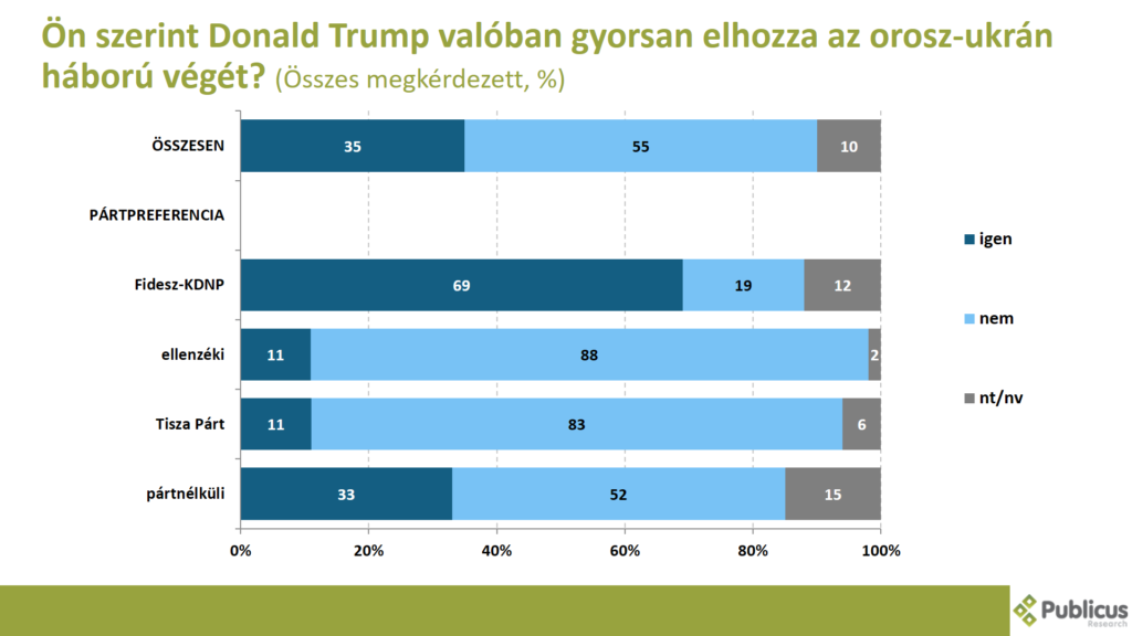 A megkérdezettek harmada (35 százalék) látja úgy, hogy Donald Trump valóban gyorsan elhozza az orosz-ukrán háború végét. Ezt mondta tízből hét Fidesz szavazó (69 százalék), a pártnélküliek harmada (33 százalék), illetve minden kilencedik ellenzéki szavazó és Tisza Párti szavazó (11-11 százalék)
